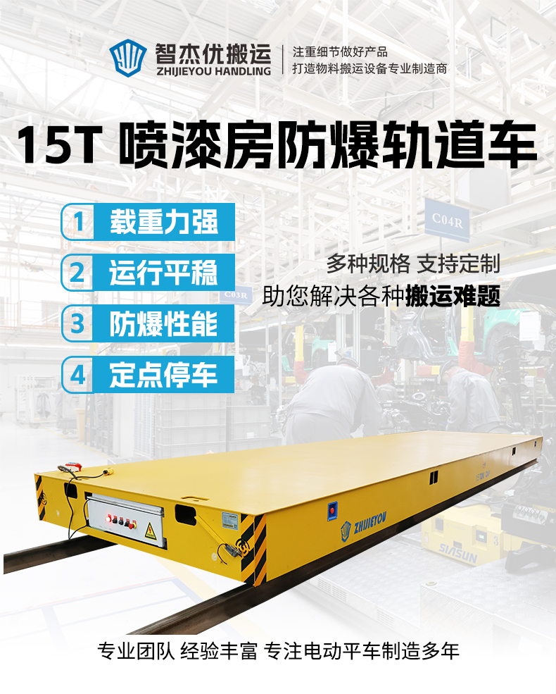 描   述: 專為噴漆房環(huán)境研制的電纜卷筒軌道平板車,整車長9米寬2.5米高0.55米額定載重15噸,主要用于工件進(jìn)入噴漆房進(jìn)行噴漆作業(yè)。低矮車身設(shè)計(jì)適應(yīng)噴漆房空間限制,便于大型工件進(jìn)出,外接控制盒控制平車進(jìn)出,采用外置電纜卷筒供電,可滿足全天候不間斷持續(xù)作業(yè),大大提高工件噴涂效率,電機(jī)及電器元件均具有一定防爆性能符合BT4等級防爆標(biāo)準(zhǔn),適應(yīng)易燃易爆惡劣環(huán)境下正常使用。