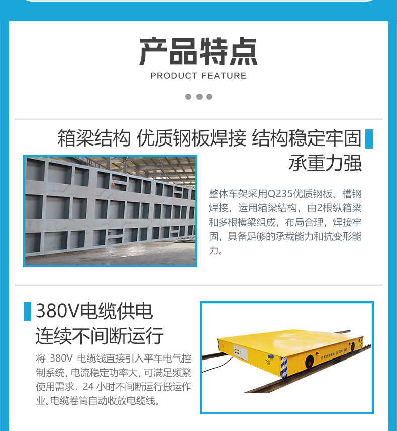 描   述: 全天候24小時(shí)進(jìn)行物料轉(zhuǎn)運(yùn)的軌道平車,該車長(zhǎng)3.8米寬3.5米額定載重30噸,輕松應(yīng)對(duì)鋼鐵、建材、機(jī)械設(shè)備等重型物料運(yùn)輸需求,采用拖電纜供電技術(shù),380V電纜線直接供給平車驅(qū)動(dòng)系統(tǒng),徹底擺脫電池續(xù)航焦慮,支持連續(xù)24小時(shí)高強(qiáng)度作業(yè),無(wú)充電等待,效率得到大大提升。一般適用于幾十米短距離頻繁運(yùn)行工況,可加裝拖鏈對(duì)電纜線進(jìn)行保護(hù)!