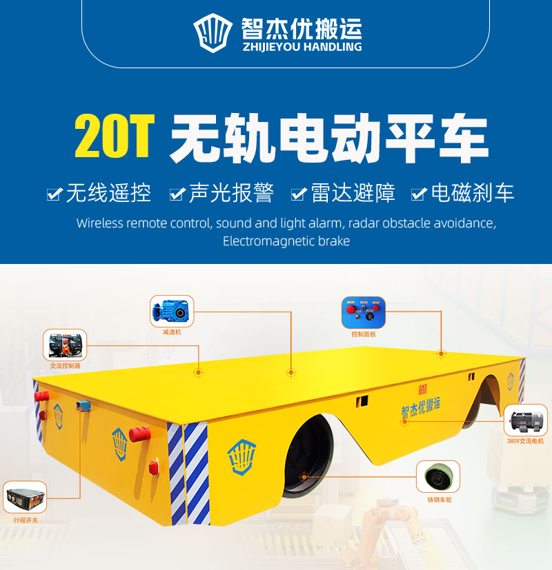 該無軌電動平車可輕松搬運20噸的貨物,平臺鋼板耐摔耐砸抗沖擊能力強,車身裝有聲光報警光電檢測遇到障礙自動停車,結合現(xiàn)代化電氣工程,可實現(xiàn)無人駕駛、遠程微機控制等多種操控方式,智杰優(yōu)制造電動平車多年,產品經驗豐富,期待您的合作。
