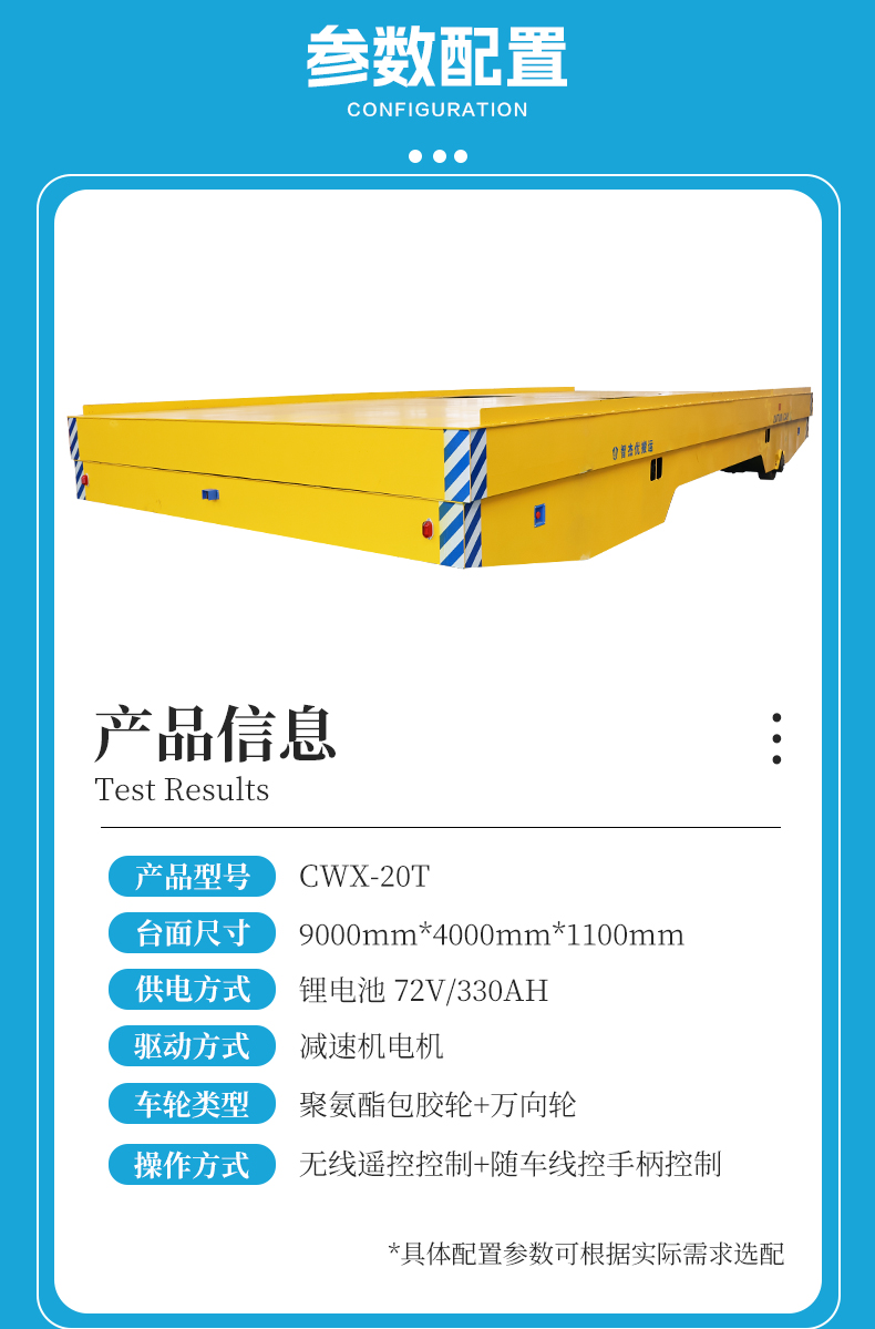 描   述: 20噸升降無(wú)軌平板轉(zhuǎn)運(yùn)車(chē),9米超長(zhǎng)臺(tái)面*4米寬體承載平臺(tái)可適配大型設(shè)備及零部件的跨車(chē)間轉(zhuǎn)運(yùn),臺(tái)面定制整體液壓升降,升降行程300mm整體頂升后車(chē)身高度可達(dá)1.4米,輕松應(yīng)對(duì)高低落差裝卸場(chǎng)景,輪系配備聚氨酯包膠車(chē)輪+萬(wàn)向輪適應(yīng)多種地面運(yùn)行,差速轉(zhuǎn)向靈活自由,可進(jìn)行原地旋轉(zhuǎn)作業(yè),車(chē)間、倉(cāng)庫(kù)、港口全域暢行!