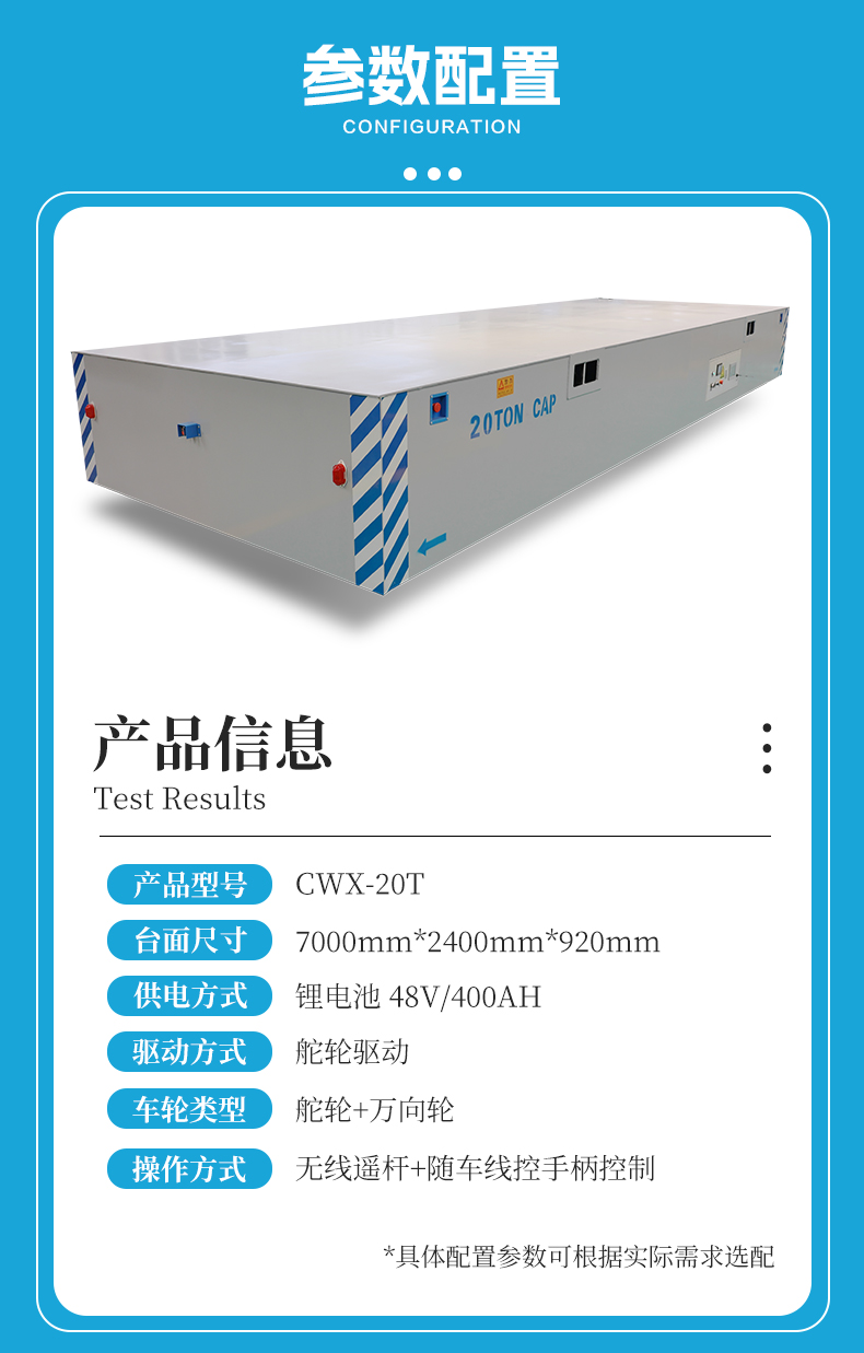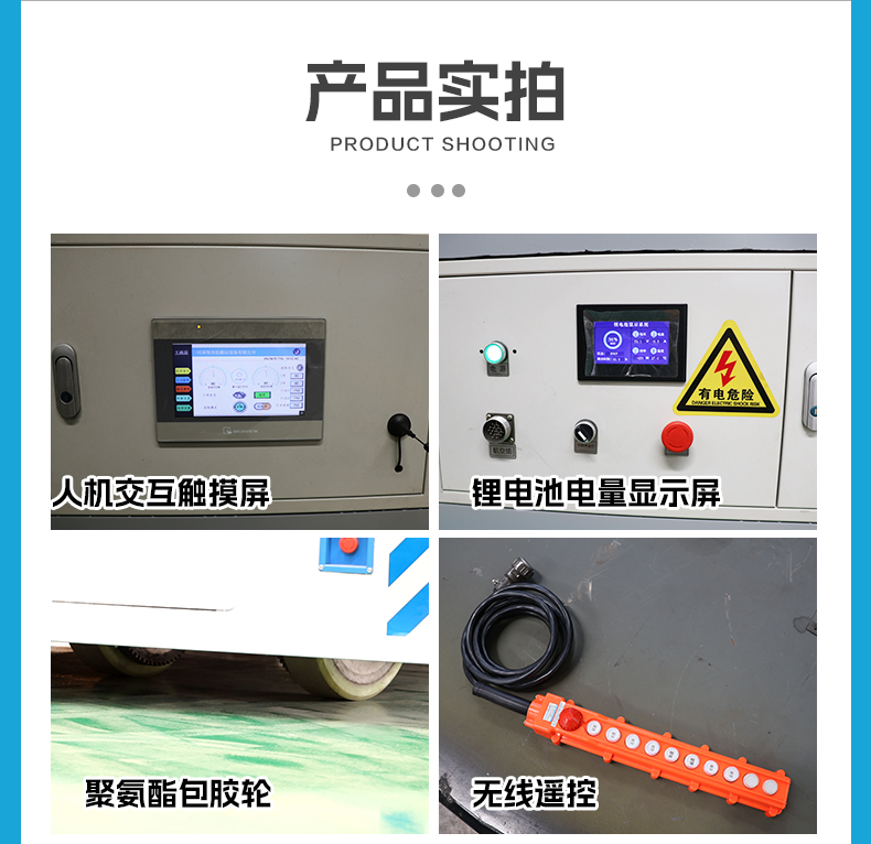描   述: 20噸全向移動(dòng)無(wú)軌平板車(chē),7米*2.4米寬大平臺(tái)0.9米定制高度,高強(qiáng)鋼焊接穩(wěn)定牢固輕松承載重型設(shè)備、大型模具,輪系配備2個(gè)高性能聚氨酯包膠舵輪+2個(gè)萬(wàn)向輪組合,配合精密伺服電機(jī)減速機(jī)驅(qū)動(dòng)動(dòng)力澎湃輸出穩(wěn)定,集前進(jìn)后退、左右轉(zhuǎn)彎、縱橫移動(dòng)、米字斜行、原地旋轉(zhuǎn)于一身,聚氨酯材質(zhì)耐磨靜音不傷地面。無(wú)線搖桿+有線手柄兩種操作模式簡(jiǎn)單方便上手快,光電檢測(cè)系統(tǒng)實(shí)時(shí)掃描障礙物,遇障自動(dòng)停車(chē)確保貨物人員安全。
