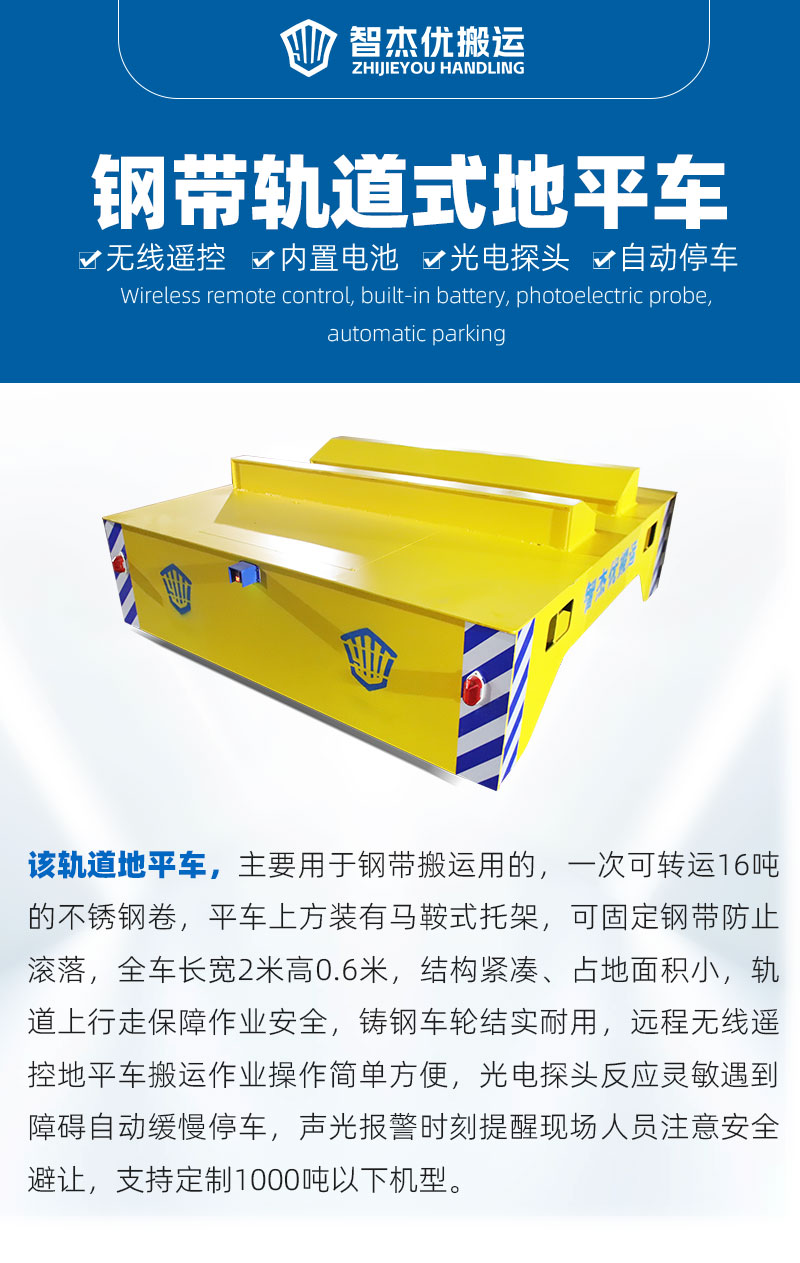 描   述: 該軌道搬運車,主要用于鋼帶搬運用的,一次可轉(zhuǎn)運16噸的不銹鋼卷,平車上方裝有馬鞍式托架,可固定鋼帶防止?jié)L落,全車長寬2米高0.6米,結(jié)構(gòu)緊湊、占地面積小。