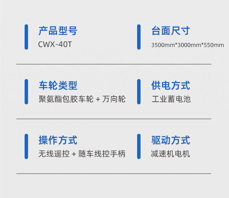 熱線:15517329551 這是一臺液壓升降全向無軌車客戶使用現(xiàn)場,長3.5米寬3米高0.55米額定載重40噸,主要用于車間內(nèi)風電設備部件的轉(zhuǎn)運作業(yè)。電機減速機驅(qū)動平車運行,蓄電池供電運行路線不受線纜限制,臺面定制液壓升降支架,可頂升工裝架,升降行程200mm,輪系采用聚氨酯包膠輪搭配萬向輪可實現(xiàn)全向運行,車間柱子阻礙下也能靈活調(diào)整方向輕松通過。無線搖桿操作控制平車運行及升降,可鉆入工裝下,完成頂升、運輸、下放工裝等動作,車體四周設有防撞滑塊,急停開關,前后安裝270度避障雷達,遇障即停,確保全向車安全往返運輸作業(yè)!